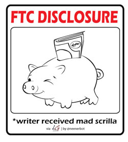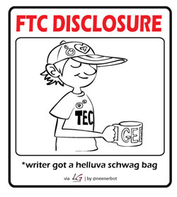 Second, the less obvious: If I interview someone and they grab the bill for lunch, I would need to specify this, as I would if I use an Amazon link that gets me 8 cents instead of an Amazon link that gets me 0 cents. If someone gives me a comfy t-shirt with a logo and I wear it in a photo, ditto. Disclaimers all over.